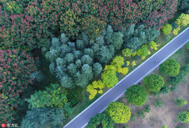 航拍江苏省淮安市柳树湾公园的植被披上秋日的彩装。秋分来临,淮安柳树湾公园的红松、雪松等树木和菊花景观带呈现出迷人般的秋色,如同油画一般。