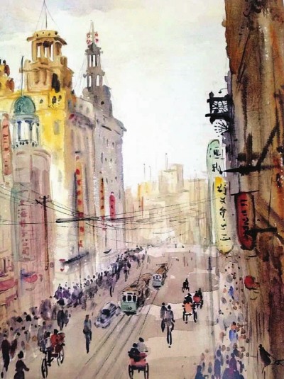 哈定经典水彩画 《繁忙的南京路》。 (展方供图)